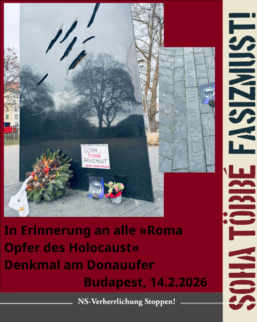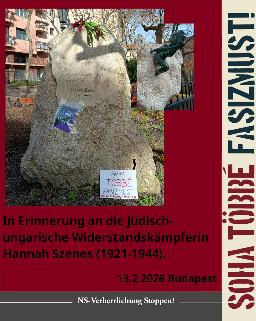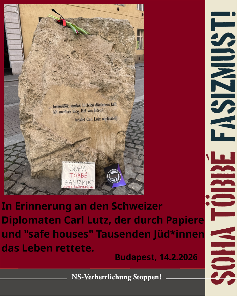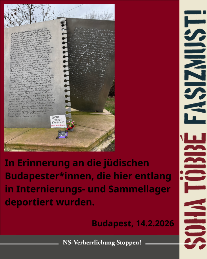 Nachdem das Orban-Regime „die Antifa“ als terroristische Vereinigung deklariert hatte, waren antifaschistische Proteste gegen die Nazi-Aktivitäten rund um den sogenannten „Tag der Ehre“ diesen Februar komplett verboten. Nichtsdestotrotz waren viele Leute auf der Straße aktiv: es gab eine Pressekonferenz unter freiem Himmel, es gab Banner-Drops in der Innenstadt, es wurden antifaschistische Plakate in der Stadt geklebt, auch an der Route der Nazi-Wanderung – und es gab antifaschistische Erinnerungspolitik an verschiedenen Denkmälern in der Stadt.