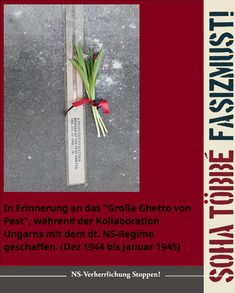 …in Erinnerung an diejenigen Jüd*innen, die im „Großen Ghetto von Pest“ eingepfercht wurden. Das Ghetto war im April 1944 nach der deutschen Besatzung von der ungarischen Gendarmerie in der Innenstadt errichtet worden. Elf Tage später begannen unter der Leitung von Adolf Eichmann am 27. April die massenhaften Deportationen nach Auschwitz. Tausende Menschen starben im Ghetto selbst, bevor es von sowjetischen Truppen befreit wurde.