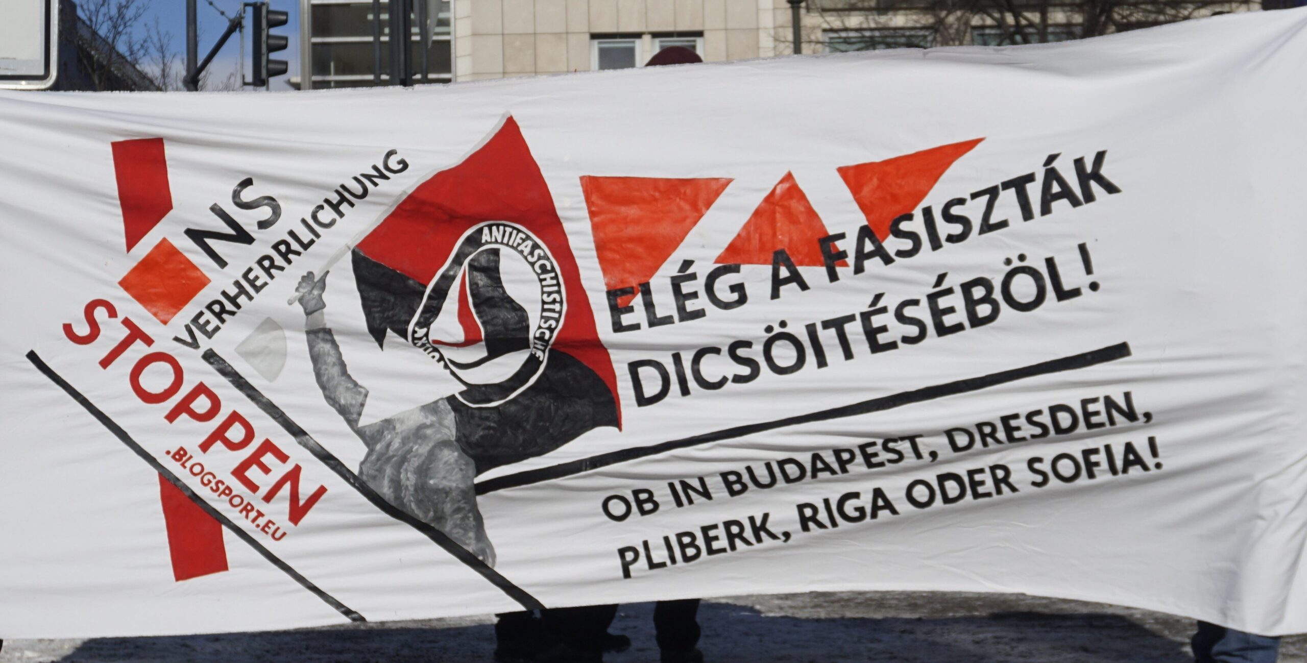 Nachdem die ungarische Regierung letzten September „die Antifa“ zur terroristischen Vereinigung erklärt hat, zeigen sich nun die Effekte: alle antifaschistischen Demos und Kundgebungen in Budapest gegen dieses NS-verherrlichende Event sind verboten worden. Auch alle Solidaritätskundgebungen vor dem Gericht, in dem der Prozess gegen Maja und andere Antifas stattfindet, wurden verboten. Diese Kundgebungen galten als „Demonstrationen zur Unterstützung terroristischer Gruppen“. Wir zitieren hier aus der Verbotsverfügung:
